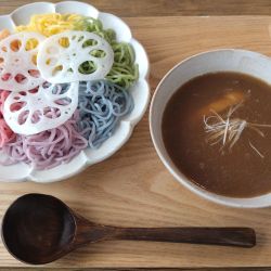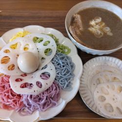 | メニュー | メニューの写真を見る 六色の麺のつけ麺 900円(どなた様でも100円引で800円) |
