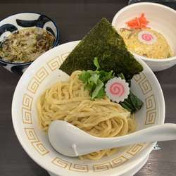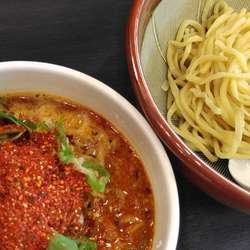 すったてはまだですが、限定で辛つけ麺がありました😆luckyです。券売機で【限定】辛つけ麺 880円 と半炒飯 380円をポチッとして空いてるカウンター席へ。店内は涼しくて大型テレビを見ながら快適な空間です。