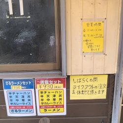 2階建ての年季の入った住宅の1階にあります。赤と黄色の縞のテント、赤のれん、セット系のメニュー掲示、入口窓はすりガラスで店内は見えません。そういえば、店外に店名がないかも?