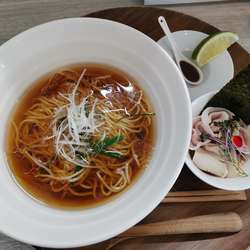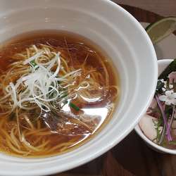 まずはコンソメスープを一口、出汁が旨い。麺は細麺、白髪ネギと葉ネギの潔いシンプルさ。低温チャーシューは2種で別皿で提供されたがあまり感動はなかった。