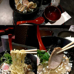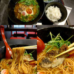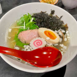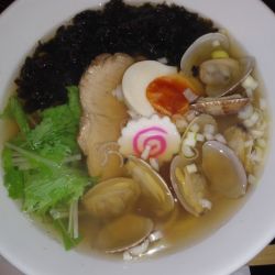 令和5年10月訪問、貝出汁が気になり、スープはそこまで貝~という感じではないが、とてもやさしい味わいでサッパリ、麺は加水率やや高めでもっちり中細ちぢれ麺、チャーシューは豚で味付けも良い、あさりは7・8粒と結構入っている。そのほかに岩ノリ、水菜、ナルト、刻みネギ、半熟加減が良い半玉がトッピング、ごちそうさまでした。