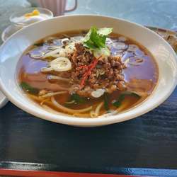 お店の名が付くラーメンを頂きました。醤油ベースのスープに豚肉、玉ねぎ、キクラゲなどを炒めた具材が乗ってます。セット内容は、水餃子二個と杏仁豆腐です。金額税込1078円でした。美味しく頂きました。