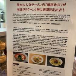 | 備考 | 「東京ラーメンショー実行委員会」監修の『東京ラーメンショーセレクション 極み麺』。好評の「楽園タウン池袋」に続き、首都圏第2弾として「南越谷ラクーン」1階に登場。 |