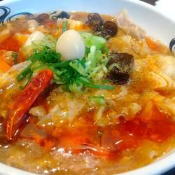 豚バラやキャベツを麻辣味の餡で絡め、啜り甲斐のありまくる幅広麺と合わせた一杯。