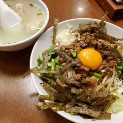 【注文】台湾まぜそばセット(1000円)。最初は台湾牛肉麺狙いで来たのだか、店頭で見かけたこれを見て急遽変更。この品はグランドメニューには載っていない。