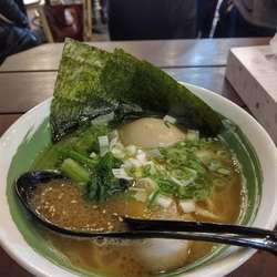 21/8/3訪問。過去分ですが、閉店しているので、足跡を残させていただきます。笑の家らーめん(780円)を、麺固めで。スープは、ずっしりとした豚骨感が印象的。醤油も強めに効く。麺は、屈強な太麺。具は、ネギ・小ねぎ・白胡麻・海苔三枚・ほうれん草・チャーシュー。味変アイテムが卓上設置ではなく、オーダー式なのが歯痒い。