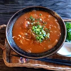 海老と大きめににカットしたタマネギがたっぷり入った酸味の強い一杯です。別皿の大葉を入れると味変が楽しめます。