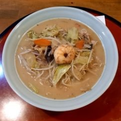 大きめのエビと豚肉に野菜(キャベツ・もやし・玉ねぎ・人参・きくらげ他)たっぷりのちゃんぽん。