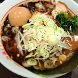 濃いめの醤油豚骨にマー油の入ったラーメンで、偶々でしょうが少しぬるめでしたが美味しく頂きました。マー油の影響で、最初はなんのベースのラーメンかもわかりませんでしたがご愛嬌。