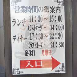 | 営業時間 | 11:30~14:30(L.O.14:00)/18:00~23:00(L.O.22:00) [日・祝] 11:30~14:30(L.O.14:00)/17:00~22:00(L.O.21:00) |