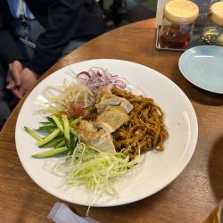 月イチの主要会議の後、比較的利用頻度の高いお店。表題メニューを何名かでシェア。茶色に染まった麺は極太縮れ麺。具は素揚げされた鶏肉と白髪ねぎ、キュウリ、モヤシ、アーリーレッドの構成。クラフトビールにホッピーを呑みながら啜る麺は、何気に相性が良い。つまみも充実しており楽しめる。ご馳走様でした。