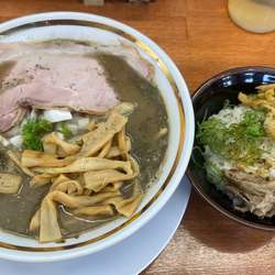 「濃厚煮干しメンマラーメン+鶏油ホロホロ肉飯」@油そば専門 清水家 船橋店の写真6月29日(水)11時20分着、外待ち5名様