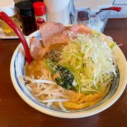 具は、ネギ・白胡麻・小松菜・もやし・チャーシュー。焼き目の付いたチャーシューは、大ぶりでずっしりとしたタイプ。