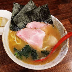 ラーメン脂少な目で無料の大盛を注文。
