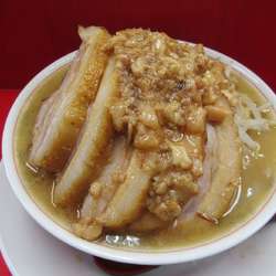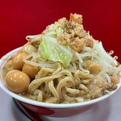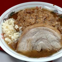 「アレ」お願いします、とトッピングオーダーすると無料の裏無料トッピングがつく面白いお店👌本日の「アレ」はフライドオニオンでした✨ライトな豚骨醤油スープなので、粗刻みニンニクの破壊力が凄いです🧄厚さ1cmの焼豚は少し硬めでしたが、G系らしいワシワシ麺で美味しくいただきました🌈卓上トッピングのマー油が在庫切れだったのが残念😢