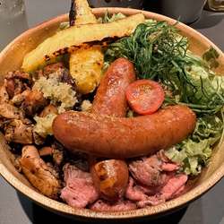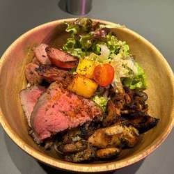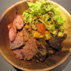名前の通りワイルドな油そば。具材のお肉、鶏モモ肉のケバブはスパイシーに仕上がっており、他にローストビーフ、パイナップル、レタス、トマト、などBBQテイストな味付け、