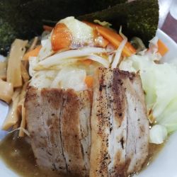 シャキシャキした野菜のボリューム多く食べ応えあり。麺は中太ストレート。海苔は大きいサイズが5枚ほど。チャーシューは塩を掛けて焼いたのかしょっぱい。見た目二郎風だが各種コールはできない。満足感あるものの価格は高い印象。