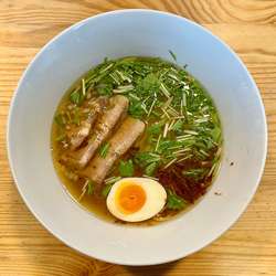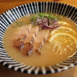 味の構成は塩だれとレモン、粗挽きの胡椒で行っているからかなんとなくエスニックな印象も受けた。具材は良く味の染みたバラチャーシュー3枚と紫玉ネギ、レモンスライス3枚、青ネギ。麺は細麺。加水率は高めに感じた。麺とスープの絡みも上々。
