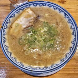 博多豚骨の香りがするスープはシンプルでありながら、強めの酸味と甘味が絡み合いながら主張してくる複雑な味わい。関東では食べたことがないタイプの担々麺。麺は短めの中太ちぢれ。追加なしで煮卵が付いてくるが、しっかり味付けされているため嬉しい。紙エプロン無