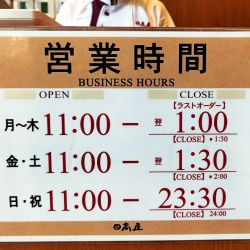 | 営業時間 | 11:00~翌1:30 [金・土] 11:00~翌2:00 [日・祝] 11:00~24:00 ※ラストオーダーは各30分 |