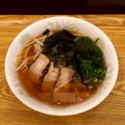 トッピングは小さめのチャーシュー3枚にもやし・ねぎと味付け海苔で、スープに油は浮いていますがさっぱりした醬油ラーメンです。硬めに茹でたもちもちのちぢれ麵は自分好みでした。