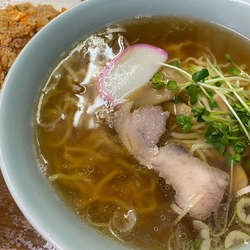 スープは、オーソドックスな色合いの醤油清湯。表層の液体油は少量。