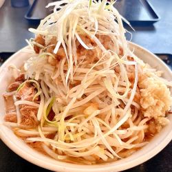 券売機で食券を購入し全部普通+サービスのネギを有りで注文、生卵にも無料トッピングが有ります、暫く待って着丼、ビジュアルが最高、野菜普通ですけどネギのせいか増しに見えます、スープはクセがなく良い塩梅で美味しい、粗挽き胡椒が良く合います、麺は柔らかめでスープと良く絡み食べやすいで... 続きを見る