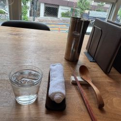 卓上にはメニュー、金属製のお水入... 続きを見る