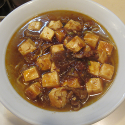 中年男性1切り盛り。L字カウンターのみ。最近食べた麻婆麺の御多分に漏れず、ややコクが控えめな醤油スープに豆板醤系の濃いめの味付けをされた餡がのり、合わせて食べると丁度良い加減になるタイプ。餡の量は少なめで、表層の3割を覆う程度。とろみの強さは中レベル。辛さはピリ辛の1段上で、痺れはない。