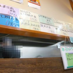 入って左手にL字カウンター。右手にテーブル3卓。本日のお薦めの麻婆麺+半チャーハンに目が留まり、麻婆麺は汁なしにもできるとのことなので、それでお願い。