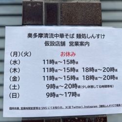 | 備考 | 秋の本格オープンに向け、現在は仮店舗で営業中。 2024.1月閉業。「奥多摩清流中華そば 三つ杉」に改名し、移転。 |