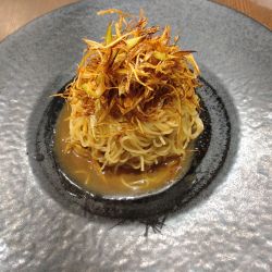焦がしネギの和えそばと但し書きのある本メニューを選択。暫く待って配膳。大きな黒い皿の中央に盛り付けられている。また、本メニュー用の味変アイテムとして、麻辣パウダーと黒酢も供される。