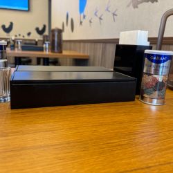 店内はほぼ居抜きの木目調の明るい、今日現在下に荷物用フックがある厨房向きカウンター6席に4人掛けテーブル席が3卓ありお水は出して頂きました(下に荷物カゴ、奥右側にお手洗いあり)。