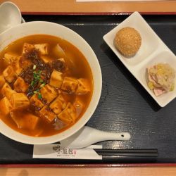 麻婆豆腐の乗った刀削麺とよだれ鶏と揚げ胡麻団子と小籠包