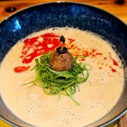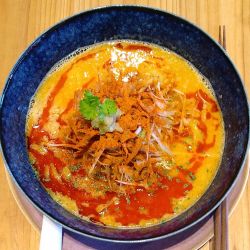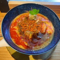 木曜日の8時15分に到着、入店。店内はカウンター6席ほどと2人卓が3卓あり、2人卓に着席。麺類のメニューは一択なので担々麺でよいかの確認あり。すぐに一片のドライレモンが登場。麺を食べる前に食べて口内をさっぱりさせて、とのこと。着丼前に店内配置の不織布エプロンを取って使用。着丼。食べ方はパウチした指南書きに沿って食べることにする。まずはドライレモンを食べてからスープを一口。ミルキ... 続きを見る
