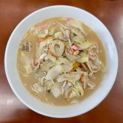 白濁したスープはしつこくないのにコクがしっかりとあり、いくらでも飲めそうです。麺は中太でちゃんぽん用のモチモチした麺です。具材には野菜、魚介、肉などが入り、いろいろ混ざっていますが、全体がよくまとまっています。