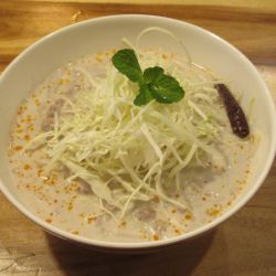 本メニューには、ココナッツミルの混ぜ麺という説明がついているが、混ぜ麺という割に汁はしっかりある。ただ、メニュー写真とはだいぶ印象が違い、キャベツの千切りがてんこ盛りになっているのと、ラー油はごく少量浮いている。
