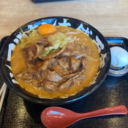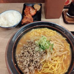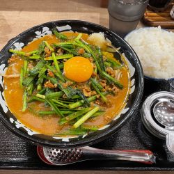 ニラたっぷりで辛く味付けされたミンチがスタミナ回復しそう。黄味が中央に鎮座して、食欲をそそります。スープも味噌らしい濃いお味に仕上がっていて、ご飯がすすみます