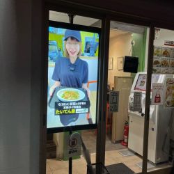 ・店の外観:白色地に緑色と赤色の文字の看板。メニューの立て看板・張り紙、赤色のひさし。
