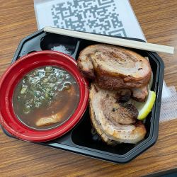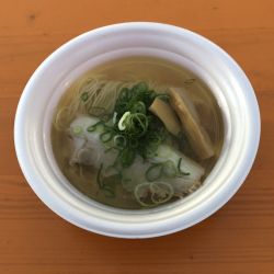 2件目用の共通チケットを買い足し,こちらのお店の15名前後の行列に接続。10分ほどでラーメンを受け取り,小雨がパラパラと降ってきたのでテント内の空いてる席に移動します。
