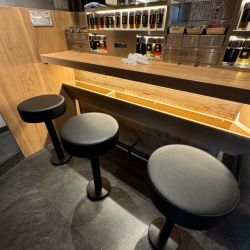 店内はグレー基調のオシャレな、今日現在下に浅い棚のある厨房向き変形コの字カウンター16席のみでお水.デドックスウォーター.黒烏龍茶、ジャスミン茶は奥にあるドリンクコーナーにてセルフ(壁側にハンガ➖掛け、折り畳み式荷物カゴは出して頂き入って左側にお手洗いあり)。