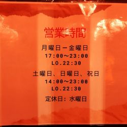 | 営業時間 | 17:00~23:00 [土・日・祝] 14:00~23:00 ※ラストオーダーは各30分前 |