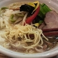 麺は平打ち気味の細ウェーブ麺。スープとの相性は良好で、細いので野菜と一緒に食べやすい