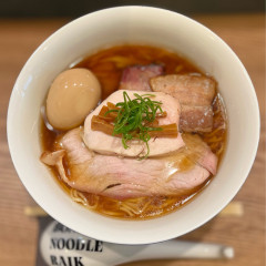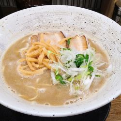 【スープ】大盛りにした麺がスープに沈まず乗っかるほどの濃密さ。一口啜ると驚きの味わい。てっきり豚骨の暴力的な濃さが来るかと思いきや、豚骨×ベジポタの複合的な旨み。他ではあまり経験のない味わいでシンプルに美味しい。塩気のバランスも良く、全体がボヤけることなく引き締まっている。別添でマー油がついてくる。結構な量が出るので割と思い切り味を変えてしまい入れすぎ注意だったか、と後悔しかけ... 続きを見る