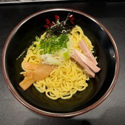 店内は東京油組統一の黒.グレー基調で縦長な、今日現在下に棚のある厨房向き変形L字カウンター8席のみでお水は出して頂きました(壁側にハンガー掛け、奥左側にお手洗いあり)。