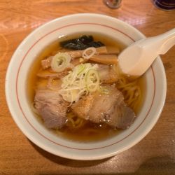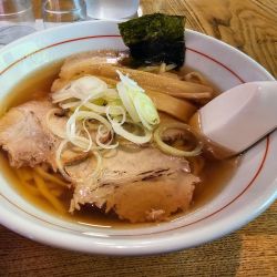 スープは、醤油の色目がやや淡めの清湯。表層の液体油はかなり少なめ。