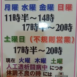 | 定休日 | 火曜、木曜 土曜(夕方より営業の場合あり) ※人工透析闘病中のため、体調不良の日は臨時休業 |