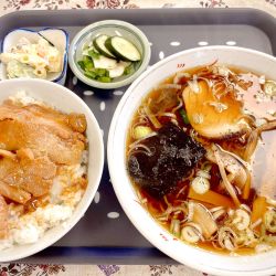セットは全部ラーメンついてくる…。すごいボリューム。おすすめはこの豚ヒレ串カツか海老カツセット…定食にラーメンついてくる…Σ('◉⌓◉’)