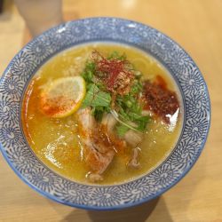 注文は600円のらーめん。せっかくなので煮卵(150円)をつけました。濃厚鶏白湯、太めの麺、水菜に糸唐辛子、鶏チャーシューと言うよりはしっかり煮込んだ鶏にレモンの輪切り。なかなか美味しらーめ... 続きを見る