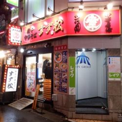 ・店の外観:赤色地に黒色と金色の文字看板、黄色の電球に囲まれた白色地に黒色文字の看板・路上設置型看板、メニューの張り紙。